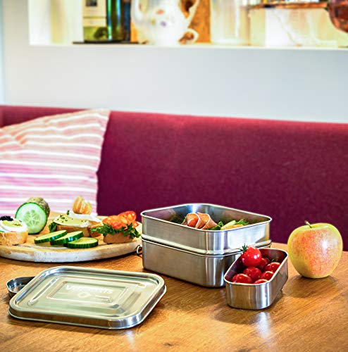 Dein optimaler und umweltfreundlicher Begleiter, wenn es um die geschätzte Brotzeit geht. Egal ob in der Schule, auf Arbeit oder beim Picknick mit Familie und Freunden. Die 3-teilige Edelstahl-Brotbox Volavault ist groß genug für alle deine Brote, Sandwiches und Snacks und dennoch kompakt genug, damit sie in jede Tasche passt. Saucen, Obst oder kleine Snacks finden in der Minibox Platz, die es von uns inklusive oben drauf gibt.